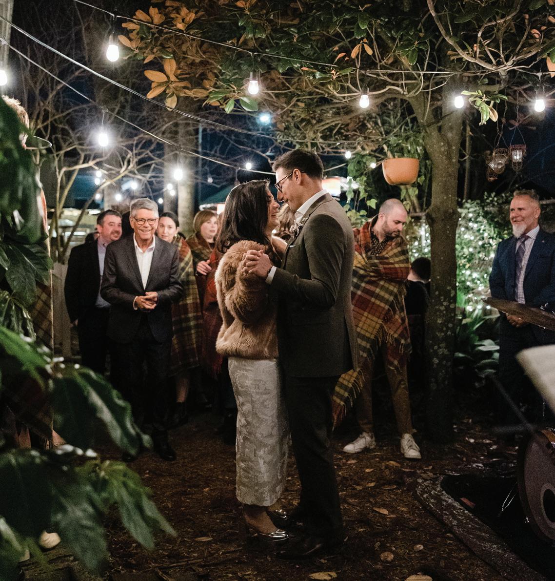 Rabbi Katie Bauman with Touro Synagogue performed the ceremony. The couple walked down the aisle together towards their parents, who were each holding up a corner of a bamboo chuppah, a Jewish tradition that represents a home. Sabrina and Adam read their own vows and family members read blessings. Guests then enjoyed a two-hour dinner of sweet potato biscuits, raw oysters, fried flounder, pickled shrimp, oyster soup, and duck confit as well as two specialty cocktails. “The food was so good, one of the guests broke kosher for the first time in their life to eat it,” Adam said. After dinner, Noah Young Trio, a suggestion of the bride’s sister after seeing the band at Bacchanal Wine, entertained guests in the backyard. As evening temperatures cooled, Andrea Mock Events was ready with heaters and wool blankets. “Considering we picked the venue without having ever visited, the music without ever hearing it and we didn’t rehearse any part of the ceremony, it all came together so perfectly,” Sabrina said.