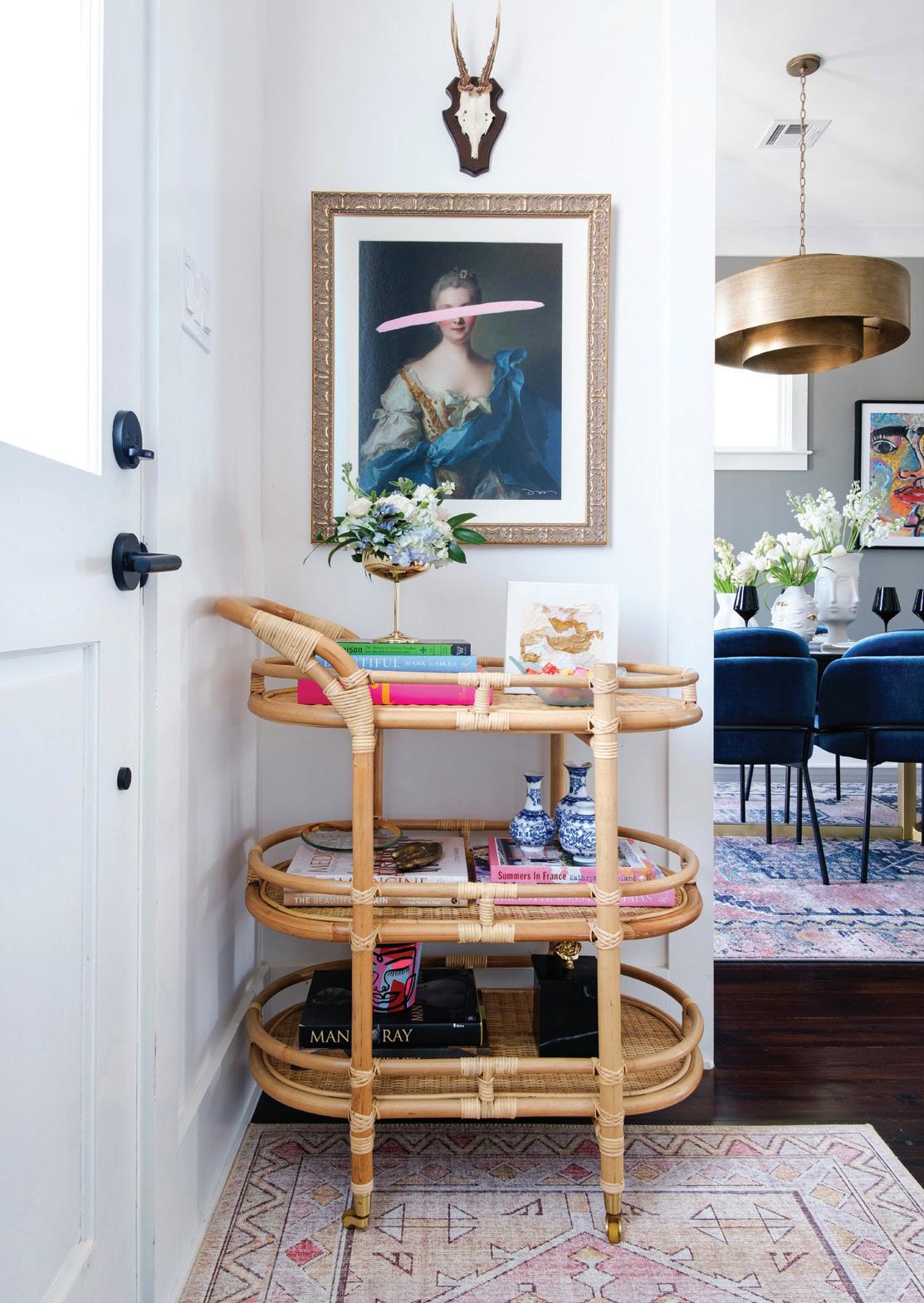 “The space called for a place to drop your mail and keys, but I didn’t want to use another cabinet or chest. It was also an odd size for a console table. The bar cart checked all the boxes, and can also be cleared off to function as a drink station for parties!”