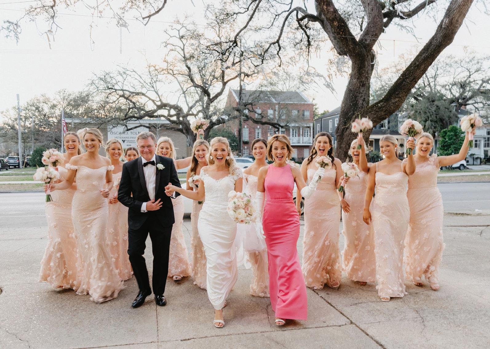 The couple envisioned a big New Orleans wedding that would bring together family and friends, who had already become close. Molly, the owner and designer of women’s lifestyle brand, Shop Molly Moran, wanted to tie in the signature bright colors found in her clothing designs. “Josh and I both have big personalities, and we wanted our wedding to reflect that,” she said. It was Josh, a software engineer, who suggested the Riverview Room as a reception venue, with large windows and balconies overlooking the Mississippi River and the French Quarter. “I loved having Josh be such an instrumental part of the planning.” The couple hired Iris and Oak Events to help with the planning and leaned on Lisa Smith from Petals n’ Parties to create pink and green tropical masterpieces, bringing Molly’s color-splashed vision to life.