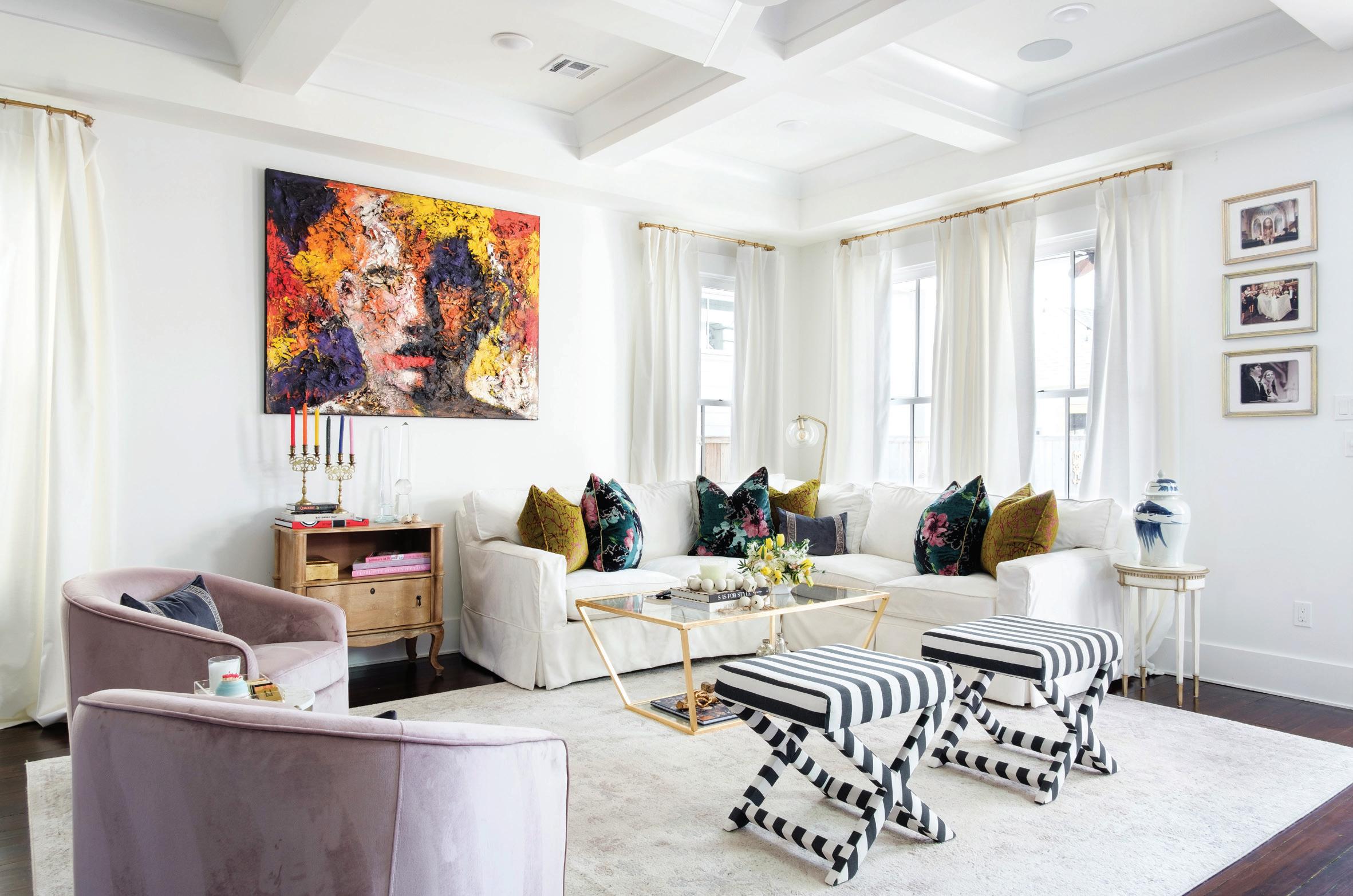 A large painting by New Orleans artist Harouni takes center stage. Megan mixed Restoration Hardware window treatments with vintage side tables, bench seating by The Inside, custom pillows by Megan Evans Interiors, and unique objects like candelabras from Estately NOLA.