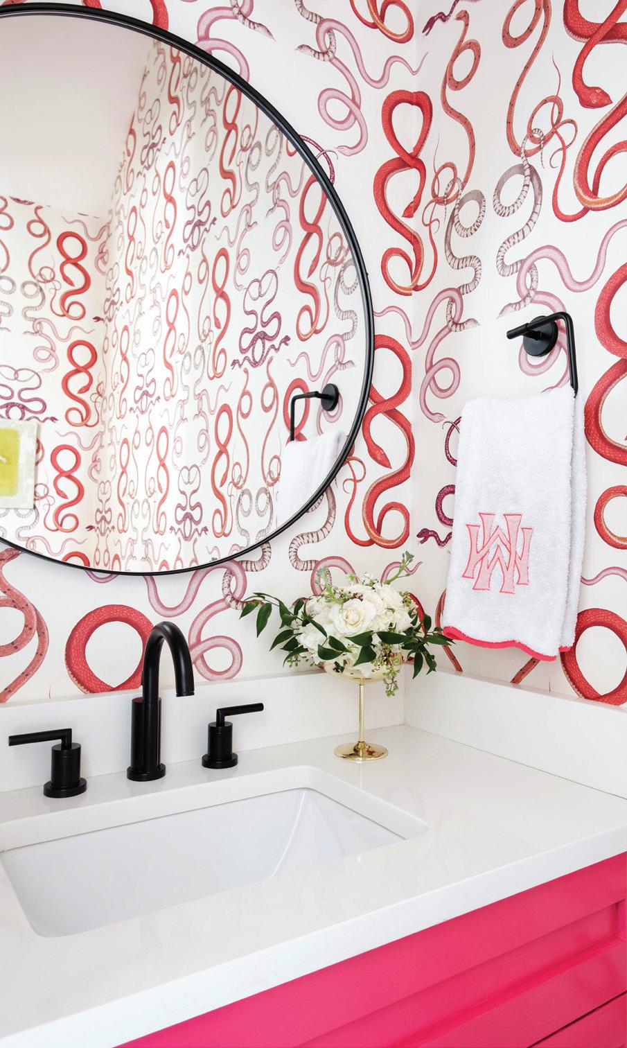 From the Schumacher wallpaper to the custom pink vanity, this powder room truly packs a punch.