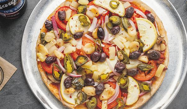 Tomatosauce,sun-driedtomatoes,freshtomatoes, yellowsquash,purpleonions,wholegarlic,fresh mushrooms,jalapenos,pineapple&kalamataolives toppedwithcrushedredpepperflakes.