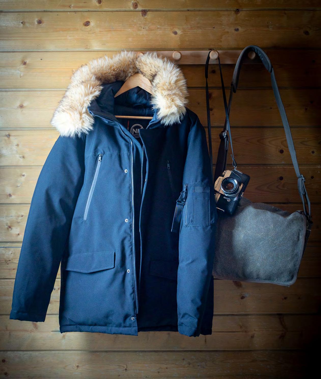 • Capuche doublée et matelassée avec fausse fourrure amovible