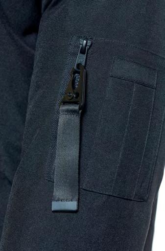 • 1 poche zippée sur la manche gauche avec mousqueton et zone de personalisation