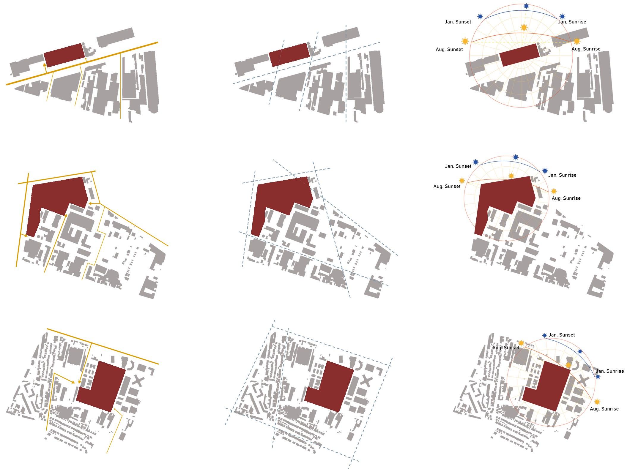 Divide block into two main functional areas based on area requirement and orient two parts based on different city functional areas.