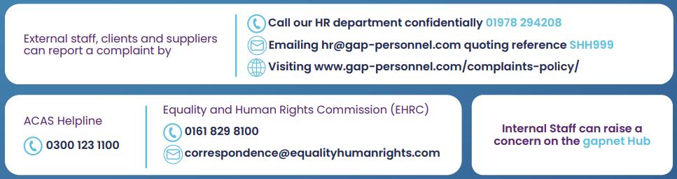 Ifyoufeelthattheresponseisunsatisfactoryandrequiresfurtherinvestigation,pleasereferyourcomplainttoanOperationsDirector If at this stage you are still not satisfied with the response, you can then submit your complaint directly to the HR Department. In all instances, to obtain correct contact details, whether that be for post, email or telephone please refer to the contact details section of ourwebsite https://www.gap-personnel.com/job-seekers-get-in-touch/