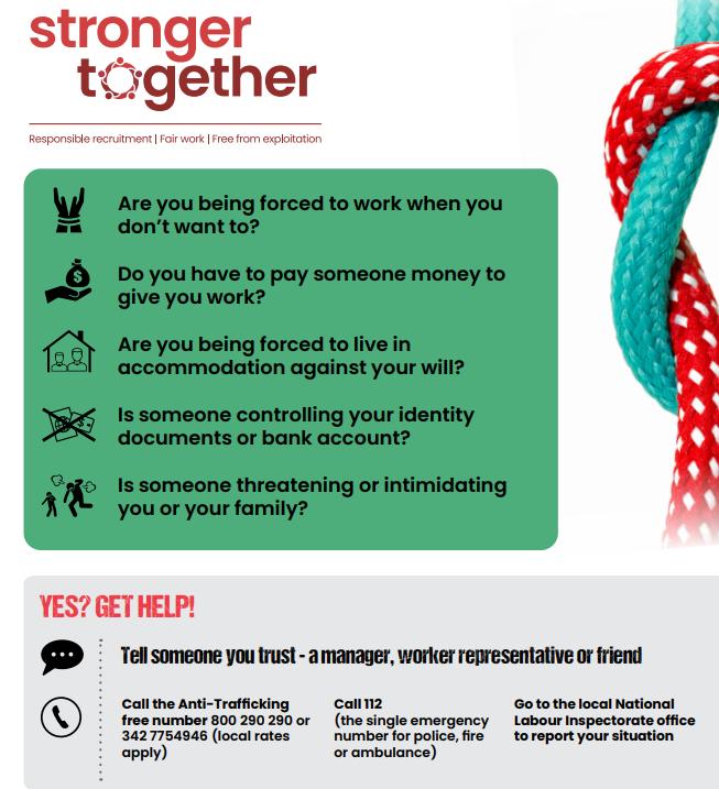 If you believe you may be a victim/concerned someone else may be a victim of human trafficking,forcedlabourandoranyotherhidden third-party exploitation of workers, please make your manager aware so we can report it to the appropriate authorities and work together to abolish these illegal activities.