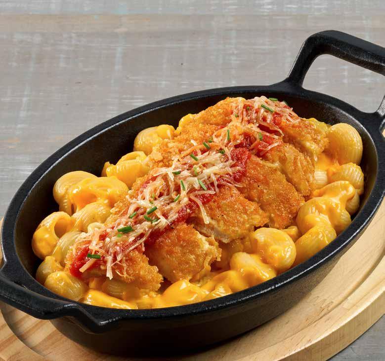Tortillas rellenas de pollo (120 gr) o queso (120 gr), gratinadas con extra queso. Servidas en sartén de hierro.