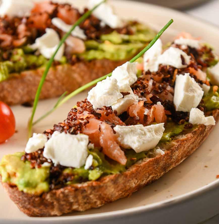 Pan de masa madre con aguacate, quinoa, salmón ahumado (50 gr), queso de cabra y un toque de chilli flakes. (2 pz)