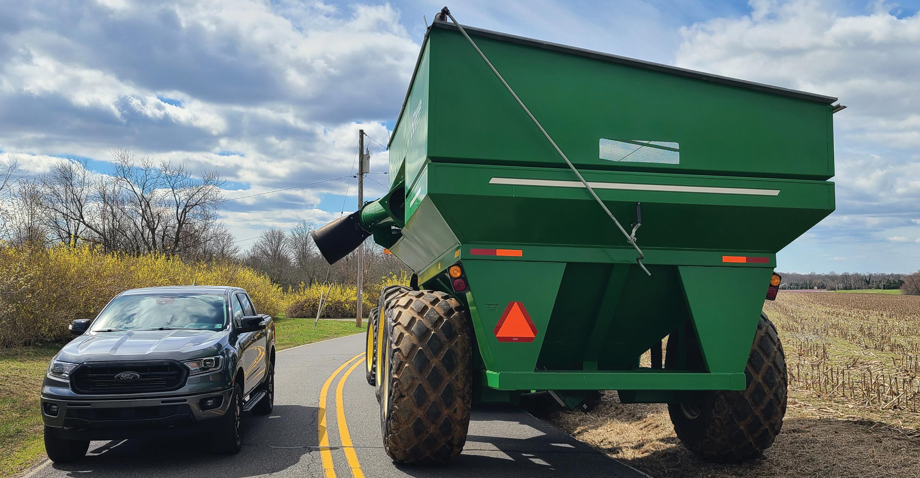 A Ford Ranger pickup truck uses caution while passing a John Deere 8235R farm tractor pulling an E-Z TRAIL 860 farm wagon on Stuart Road in North Hanover Township, Burlington County, NJ.