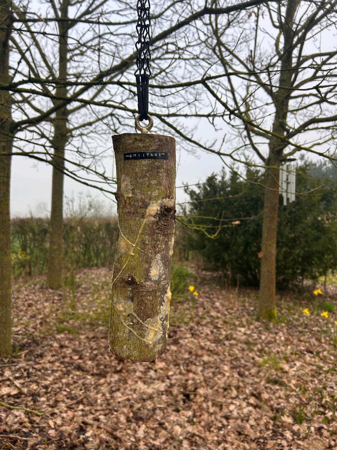 One of the varieties I chose was Shittake and it specifically says the log cannot touch the ground because it’s not a strong mycelium and can get over taken by other varieties in the soil So I decided to create hanging logs using hanging basket chains and an eyelet on top of the log I think they create a really quirky feature hanging from the tree branches, and will look even better when there are mushrooms growing out of them.