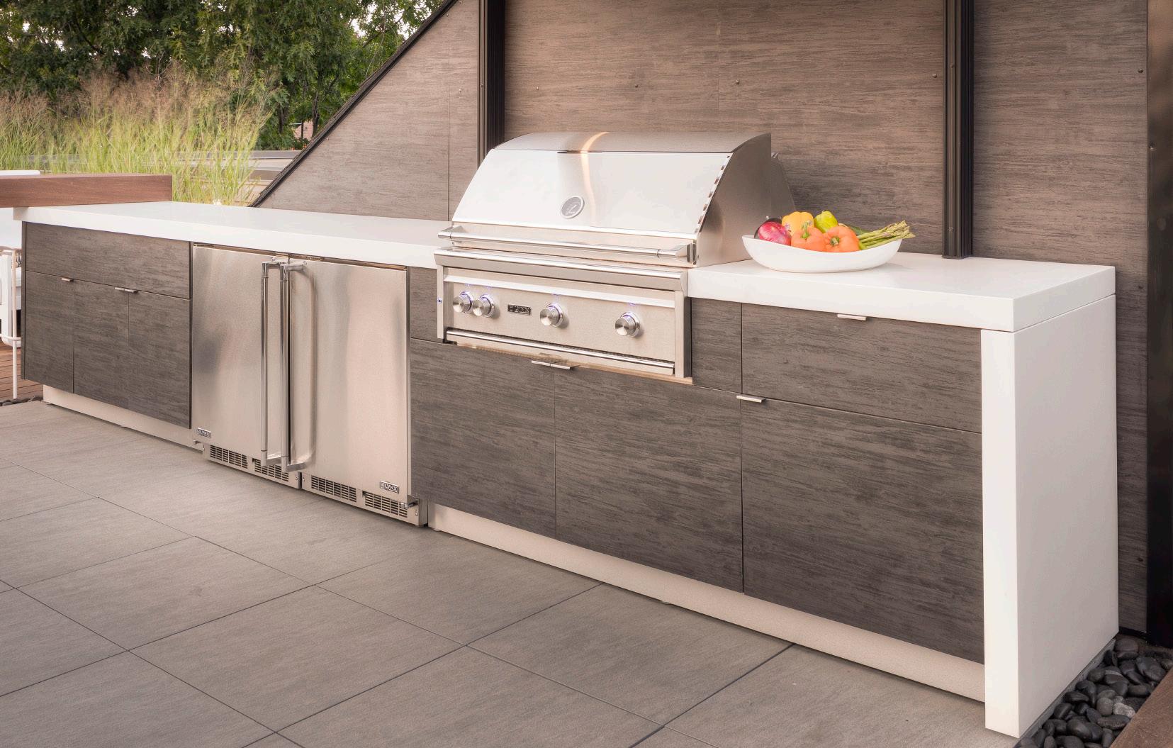 3 Features | Overhead pergola shade + task lighting, refrigeration station with bar seating & serving area Finishes | Endura® Uyuni countertop, Slate Wood cabinets