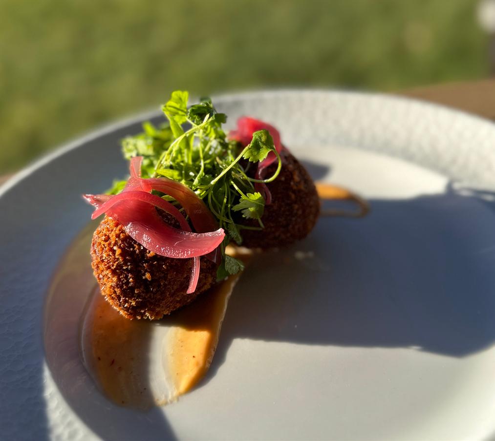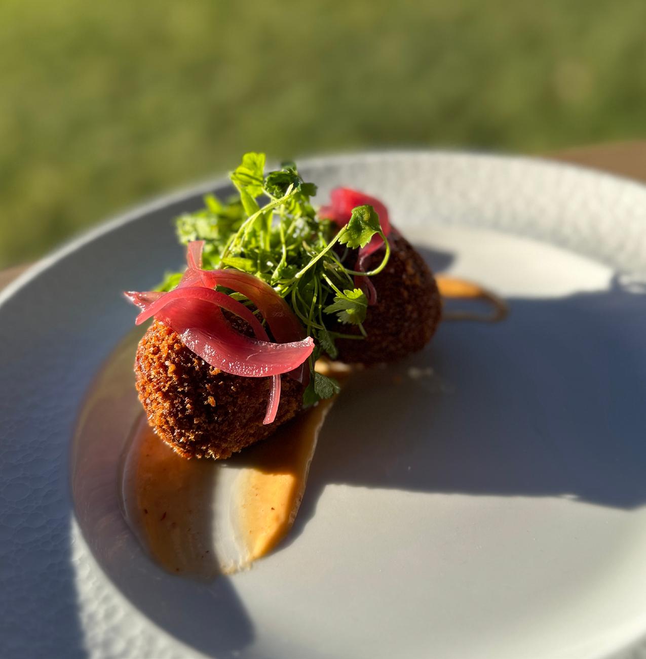 Duck legs are cooked for 12 hours in a mixture of rosemary, thyme, shallots, garlic and duck fat. Then we pull the meat from the bone and combined with yukon gold mashed potatoes and coated in panko before we fry them to a golden perfection. Croquettes are served with a chipotle aioli and topped with pickled red onions and an herb salad.