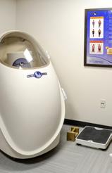 The BodPod uses air displacement to determine many health factors. In about ten minutes, you will receive a report with your body volume, body density, total body weight, weight of lean mass, weight of fat mass, and percentage body fat.