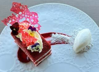This month, come indulge in Chef Heather’s amazing Red Velvet Cake! It boasts a light sponge, luscious cream cheese frosting, raspberry gel, and a refreshing Greek yogurt sorbet that beautifully ties all the flavors together. Find it in Grand View & Rocks Lounge..