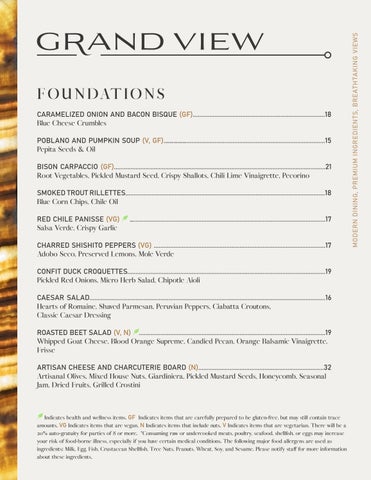 Indicates health and wellness items. GF Indicates items that are carefully prepared to be gluten-free, but may still contain trace amounts. VG Indicates items that are vegan. N Indicates items that include nuts. V Indicates items that are vegetarian. There will be a 20% auto-gratuity for parties of 8 or more. *Consuming raw or undercooked meats, poultry, seafood, shellfish, or eggs may increase your risk of food-borne illness, especially if you have certain medical conditions. The following major food allergens are used as ingredients: Milk, Egg, Fish, Crustacean Shellfish, Tree Nuts, Peanuts, Wheat, Soy, and Sesame. Please notify staff for more information about these ingredients.