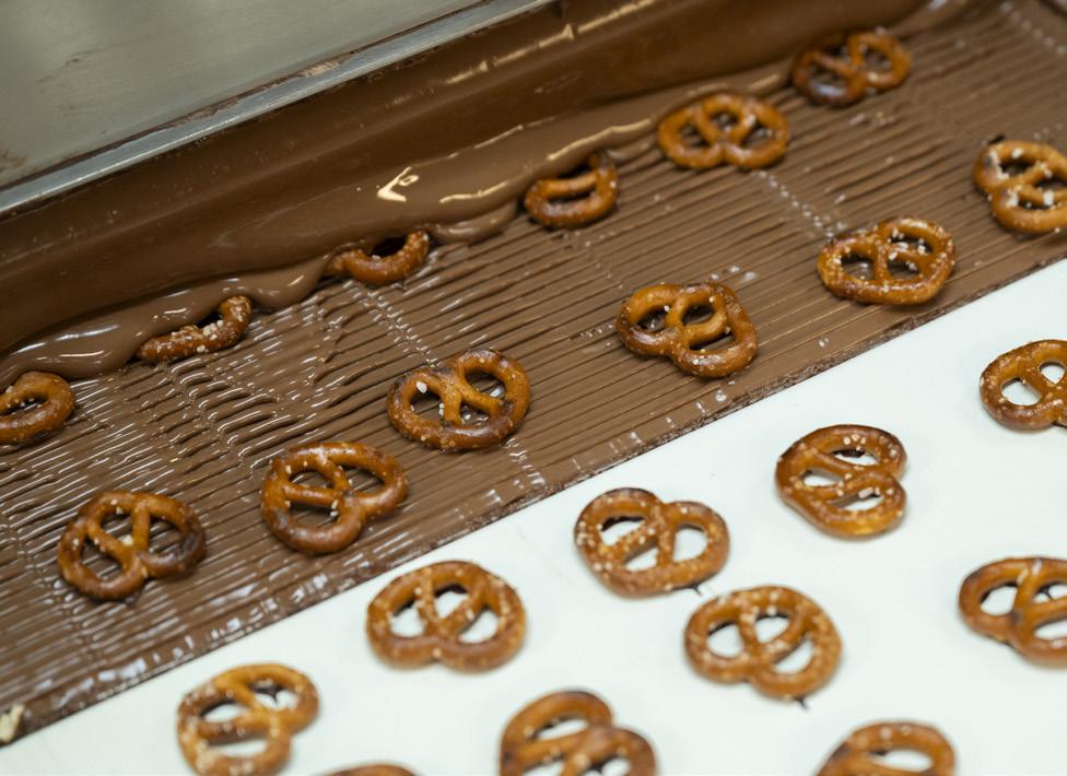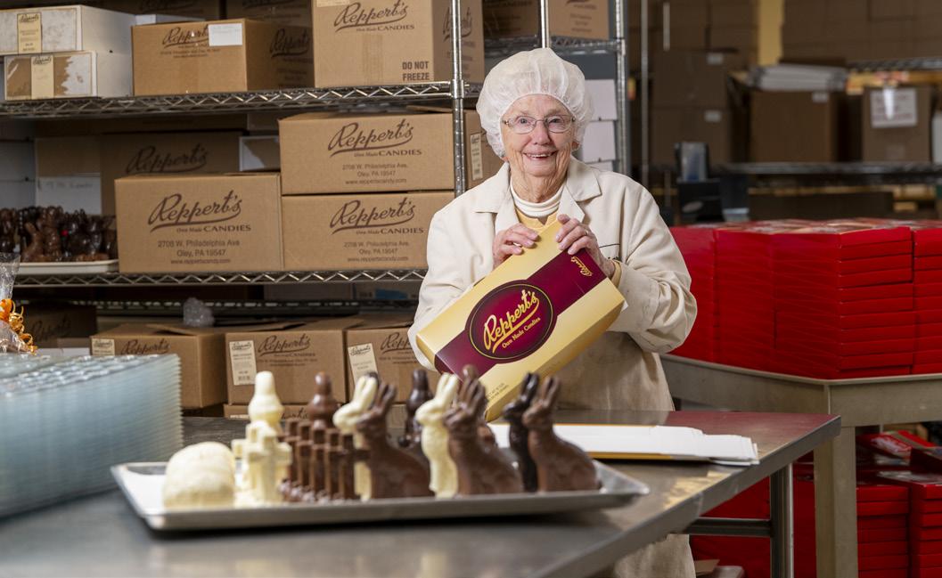At age 88, Jean has stepped back from some of the tasks but still helps with folding boxes, packing chocolates, and occasionally filling in on the production line. Reppert’s Candy produces over 65 varieties of candy and has approximately 200 different shapes of molds, so there is always something to do. The end of each season brings the start of production for the next line of specialty chocolates, from molded Santas to buttercream-filled Easter eggs and more.