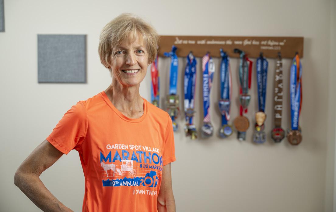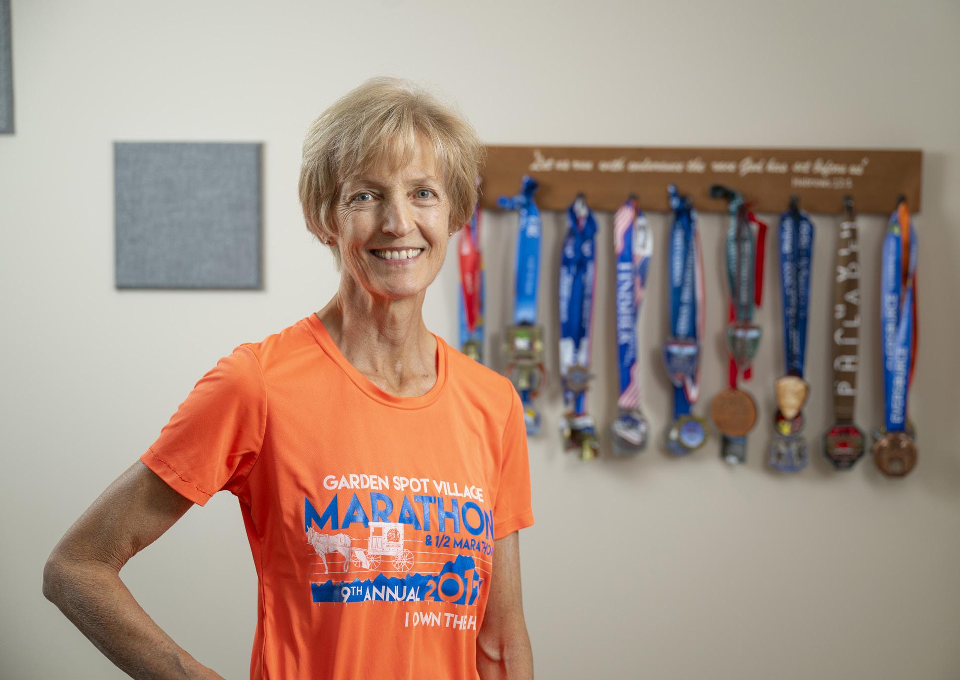 Both Kate and Bob run for exercise, but Kate got the racing bug in her 50s. She started with a 5K, then added a 10-mile race and a half-marathon. Her first marathon was at age 57, when she ran the Garden Spot Village Marathon.