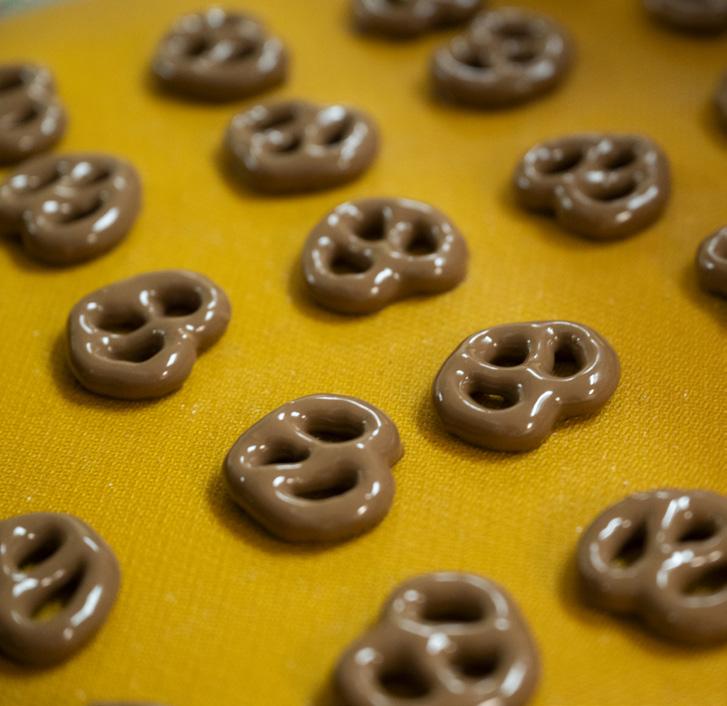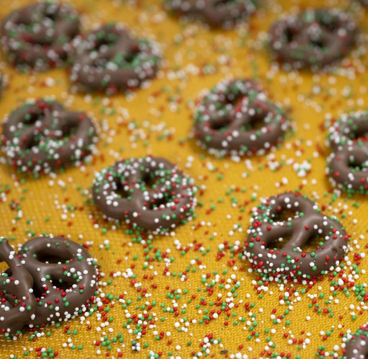 combinations,” she says. Recently, the store partnered with Yum Crumbs to create a new line of flavorful coated pretzels, available in flavors like cinnamon bun, strawberries and cream and birthday cake. “Keith is also very economical and careful to use his resources well,” says Jean. There are no sprinkles that go to waste at the end of the production line! As for Jean, her favorite candies are the “crunchy ones” like almond butter crunch.