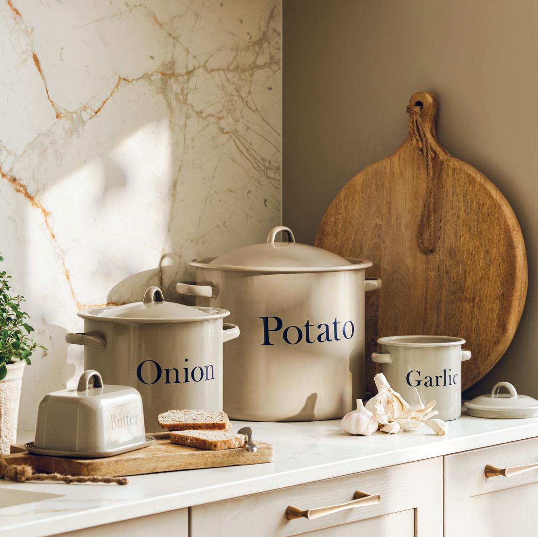 The Enamel collection: Potato Store £40; Onion Store £25; Garlic Store £10; Butter Dish £15