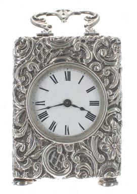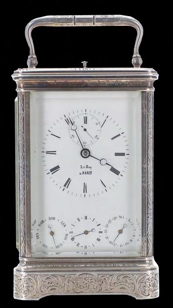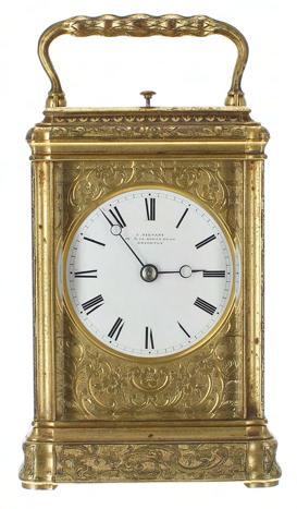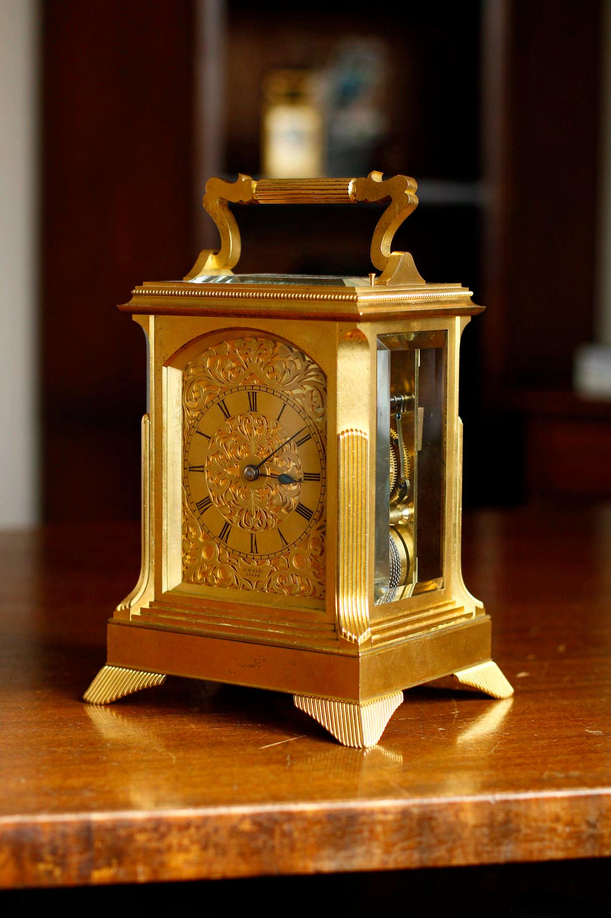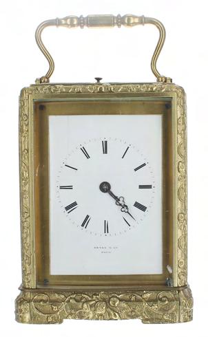 French repeater carriage clock striking on a bell, the dial plate and movement back plate both inscribed Henry & Co, Paris, within an ornate case modelled in relief with foliage, 7.25" high (key)