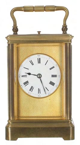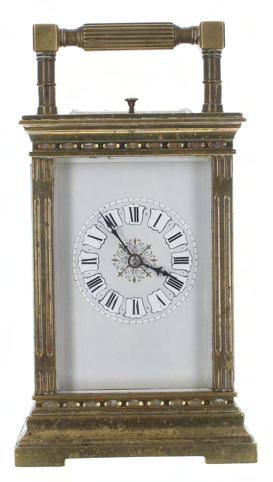 French carriage clock striking on a bell, within a corniche brass case, 7" high (key)