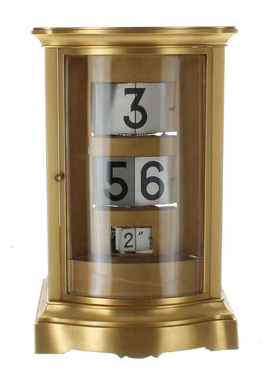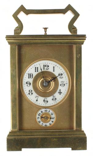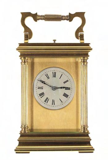 Carriage clock timepiece, within a circular bevelled glazed brass case, 6.75" high