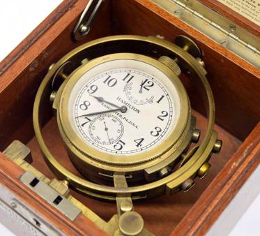 Ships bulkhead clock timepiece, the 5" cream dial with subsidiary seconds dial and slow/fast lever at twelve o'clock, within a blackened casing; also another mahogany wall timepiece, the 6" white dial inscribed Patent Lever Escapement, with subsidiary seconds dial and slow/fast lever, within an octagonal surround and two old chronometer cases (4)