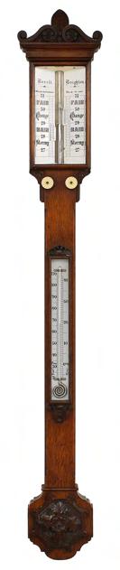 Oak stick barometer, the angled scale signed Boxell, Brighton, over a flat trunk fitted with a thermometer and Gothic style foliate carved cistern cover below, surmounted by a scrolling carved foliate cornice £120-180