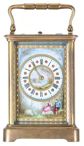 Good French repeater porcelain panelled carriage clock striking on a gong, the movement back plate stamped Patent Surety-Poller, Paris, no. 43558, the 2.25" chapter ring enclosing a lakeland scene over a rural landscape with a courting couple and sheep, also painted to the sides with courting couples in rural landscapes, in a corniche brass case, 7" high (key)