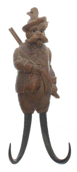 Comptoise two train wall clock, the 8.5" white convex dial within a gilt surround embossed with fruiting vines and nesting birds to the arch, 15.5" high overall (pendulum, two weights and winding key); also a Black Forest two train wall clock striking on a bell, the 4" white dial within a gilt and coloured surround embossed with a dog and birds amidst foliage, within a glazed ebonised case, 9.5" high (two weights but no pendulum) (2)