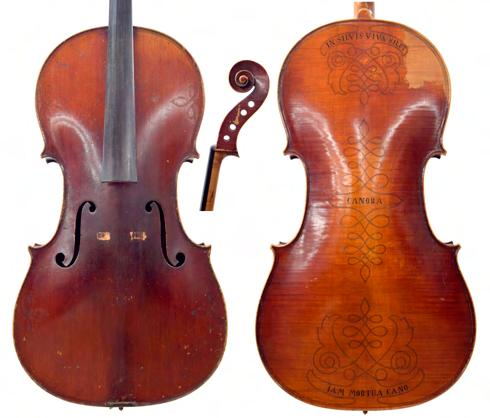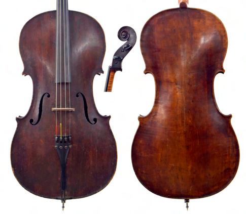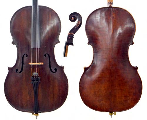 18th century English violoncello in need of restoration faintly inscribed J. Brown, London... to the inner back, the two piece back of very faint medium/broad curl with similar wood to the sides, the head of plainish wood, the table of a medium width grain and the varnish of a dark plum red colour on a golden ground, 28 3/4", 73cm £800-1400