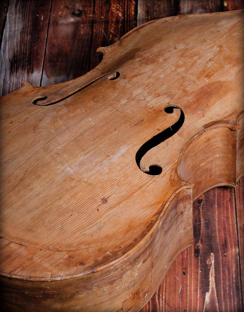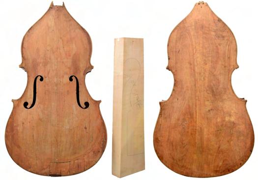Interesting Italian swell back double bass body by Joseph (Giuseppe) Marconcini, Ferrara, 1805, with steep sloping shoulders, violin corners, the back and sides of poplar and the table of spruce, length of back 42 7/8", stop length 22 1/4", ribs 7 1/4", upper bouts 18", waist 14 1/8", lower bouts 25 1/2"