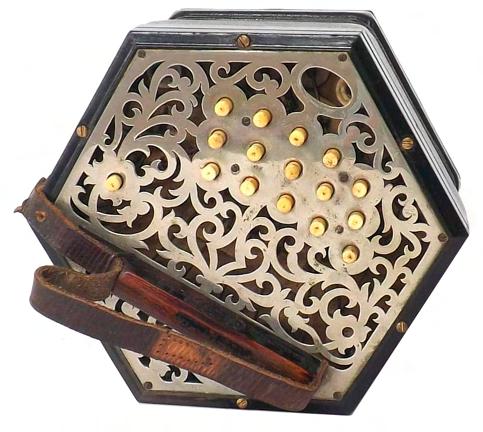 C. Jones concertina in need of restoration, with twenty-seven bone buttons on pierced mahogany ends, five-fold bellows £40-80