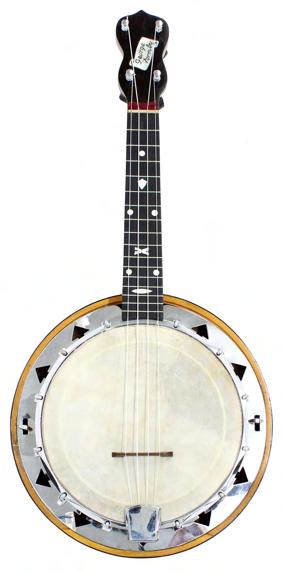 George Formby Dallas E banjolele, with geometric mother of pearl inlay to the fretboard, bearing an inlaid mother of pearl scroll plaque to the headstock inscribed George Formby and stamped E/1130 verso, within a fitted case £600-800