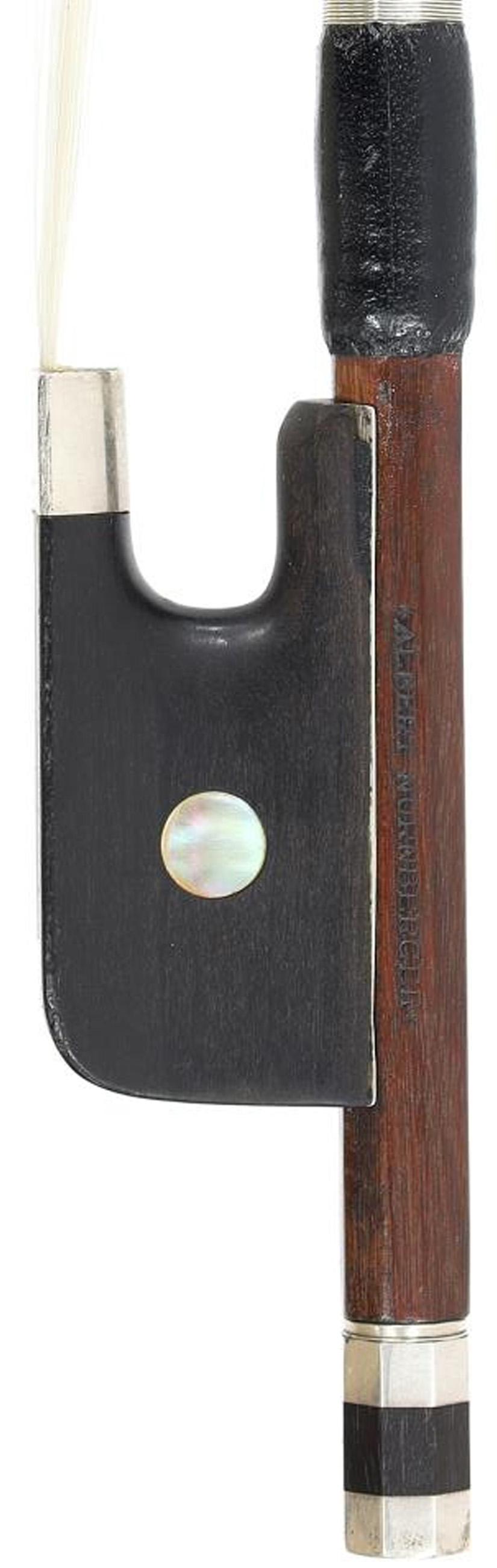 German silver mounted violoncello bow stamped *Albert Nurnberger*, the stick round, the ebony frog inlaid with pearl eyes and the ebony adjuster with two silver bands, 72gm