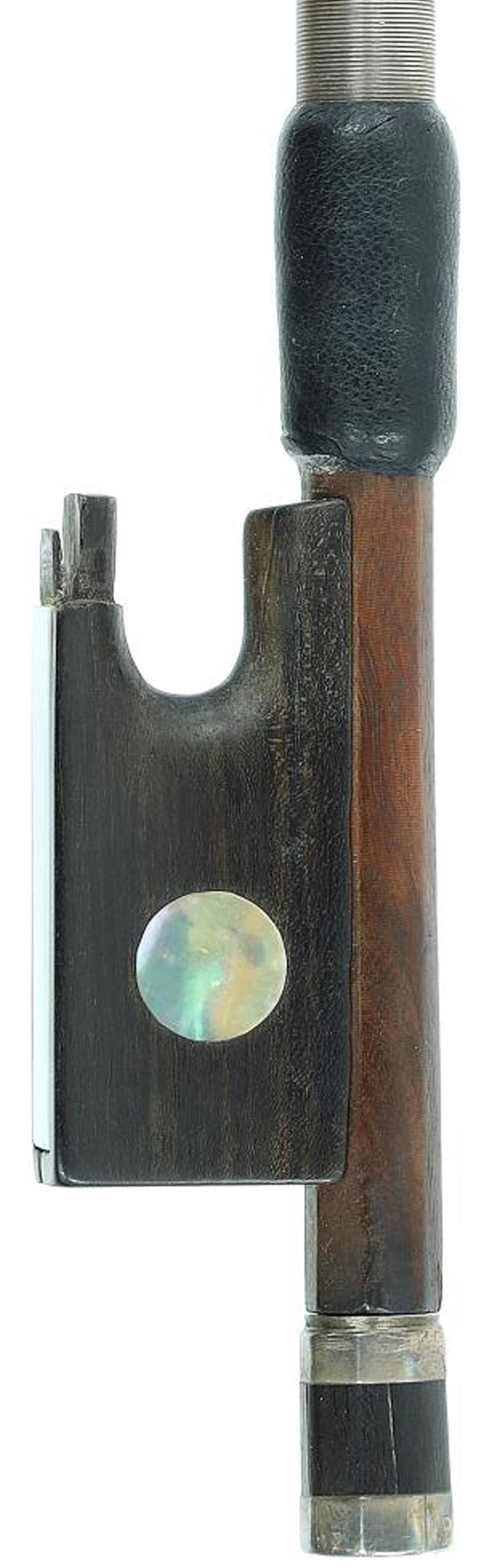 German silver mounted violin bow with a certificate stating as by Ludwig Bausch, unstamped, the stick octagonal, the ebony frog inlaid with large pearl eyes and the ebony adjuster with two silver bands, 62gm