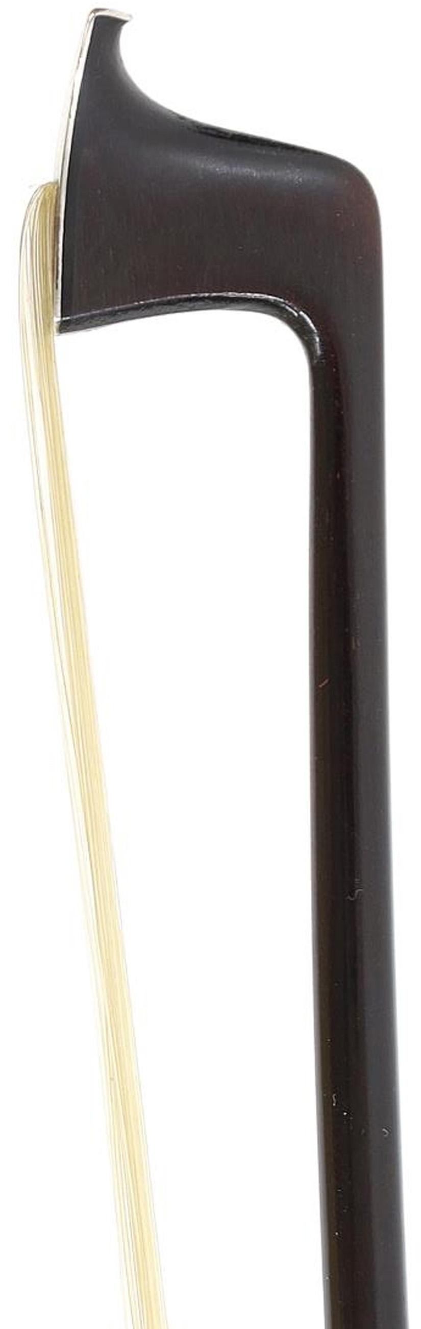 German silver mounted violin bow by and stamped C.A. Hoyer, the stick round, the ebony frog inlaid with pearl eyes and the ebony adjuster with two silver bands, 54.5gm