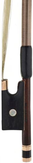 PRIVATE COLLECTION - German gold mounted violin bow by and faintly stamped Albin Hums, the stick octagonal, the ebony frog inlaid with pearl eyes and the ebony adjuster with two gold bands, 62gm