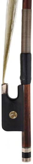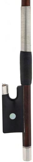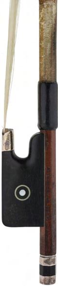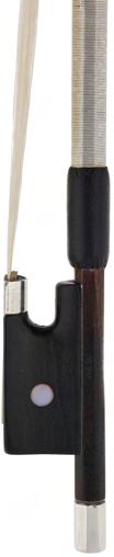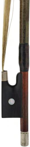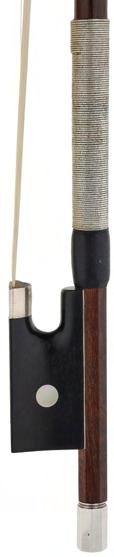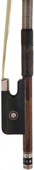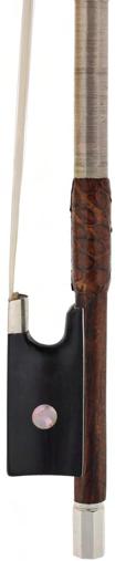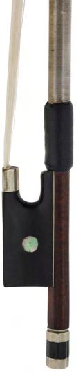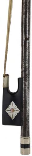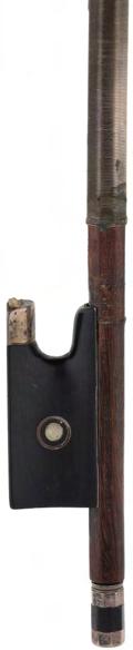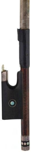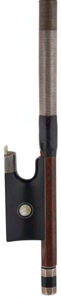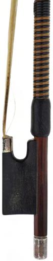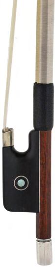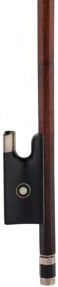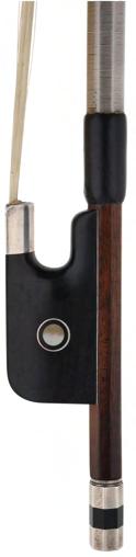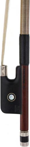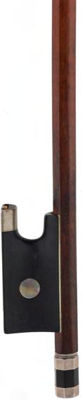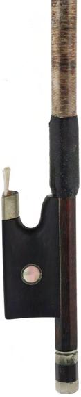PRIVATE COLLECTION - Silver mounted violin bow indistinctly stamped MuhL, the stick round, the ebony frog inlaid with silver rings enclosing pearl eyes and the ebony adjuster with two silver bands, 57gm (without hair)