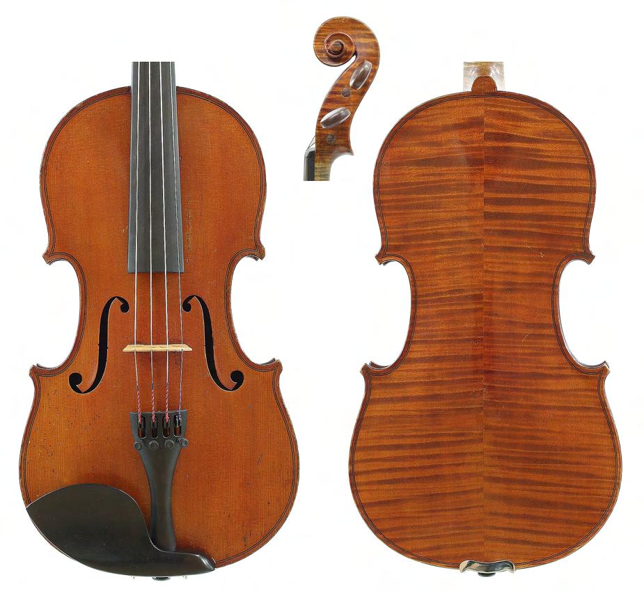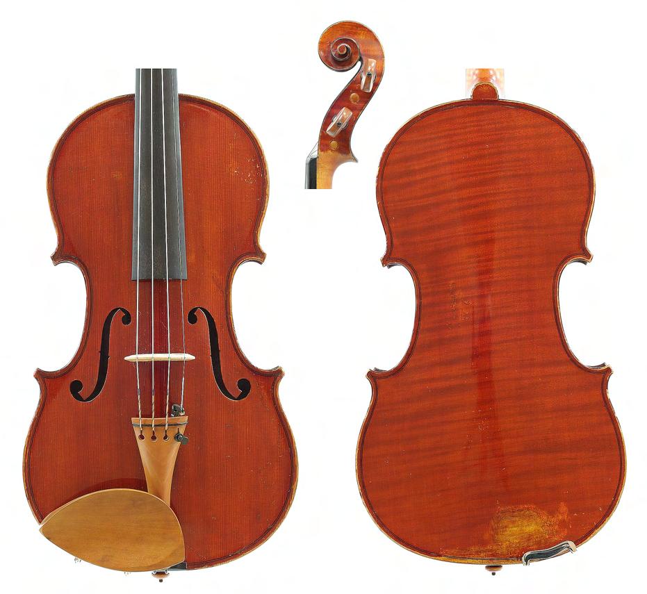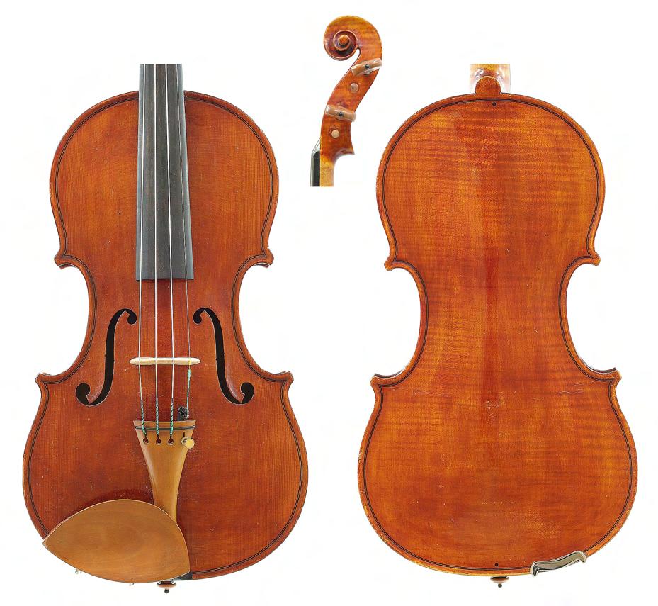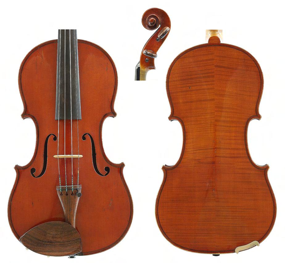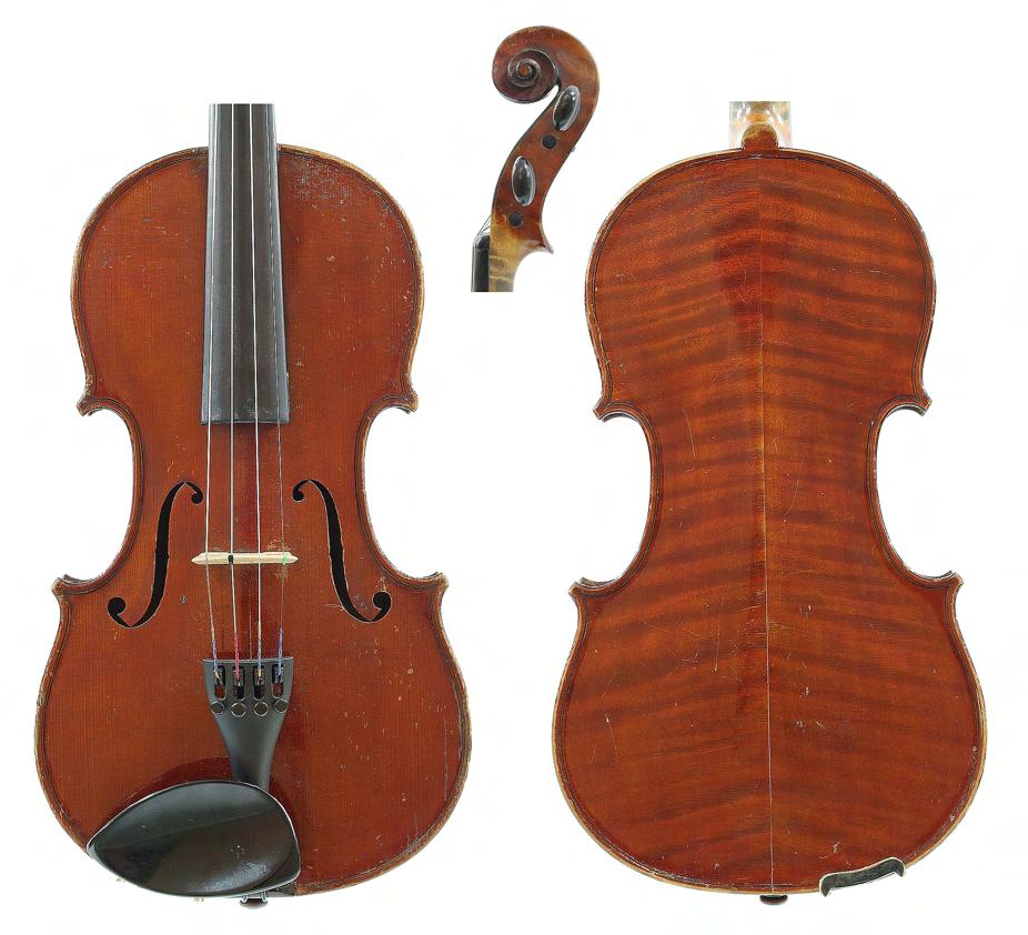 French violin circa 1920 labelled Maurice Mermillot, 51 Rue Fontaine-au-Roi, 51, Paris, the one piece back of faint medium curl with similar wood to the sides and head, the table of a medium/fine width grain and the varnish of a reddish colour on a golden ground, 14 1/16", 35.70cm £2000-3000