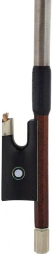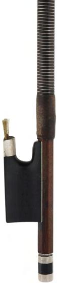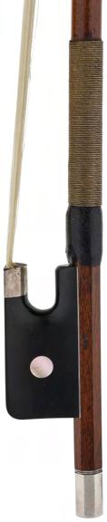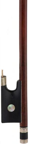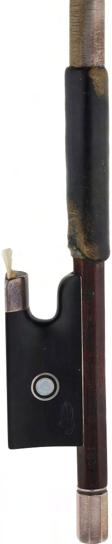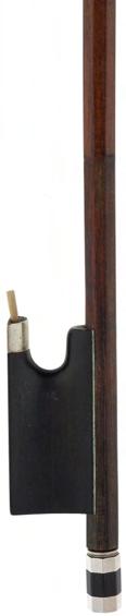 PRIVATE COLLECTION - Silver mounted viola bow, unstamped, the stick round, the ebony frog inlaid with pearl eyes and the ebony adjuster with two silver bands, 60gm (without hair and lapping)