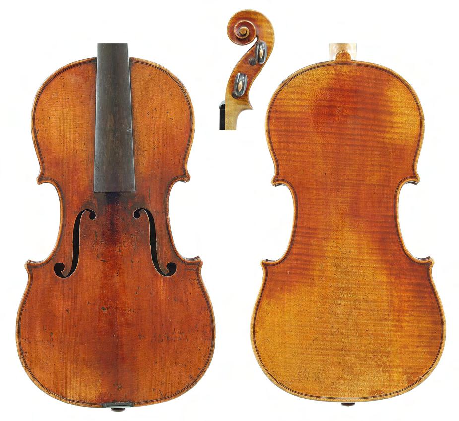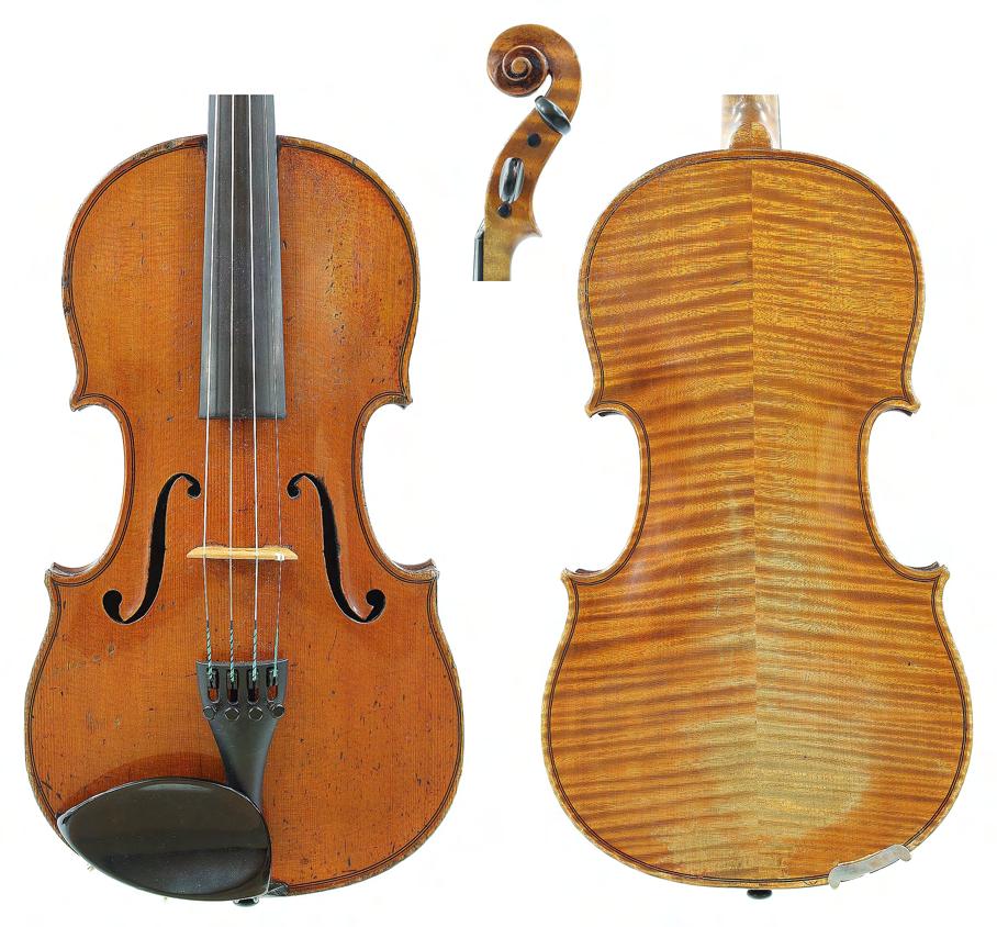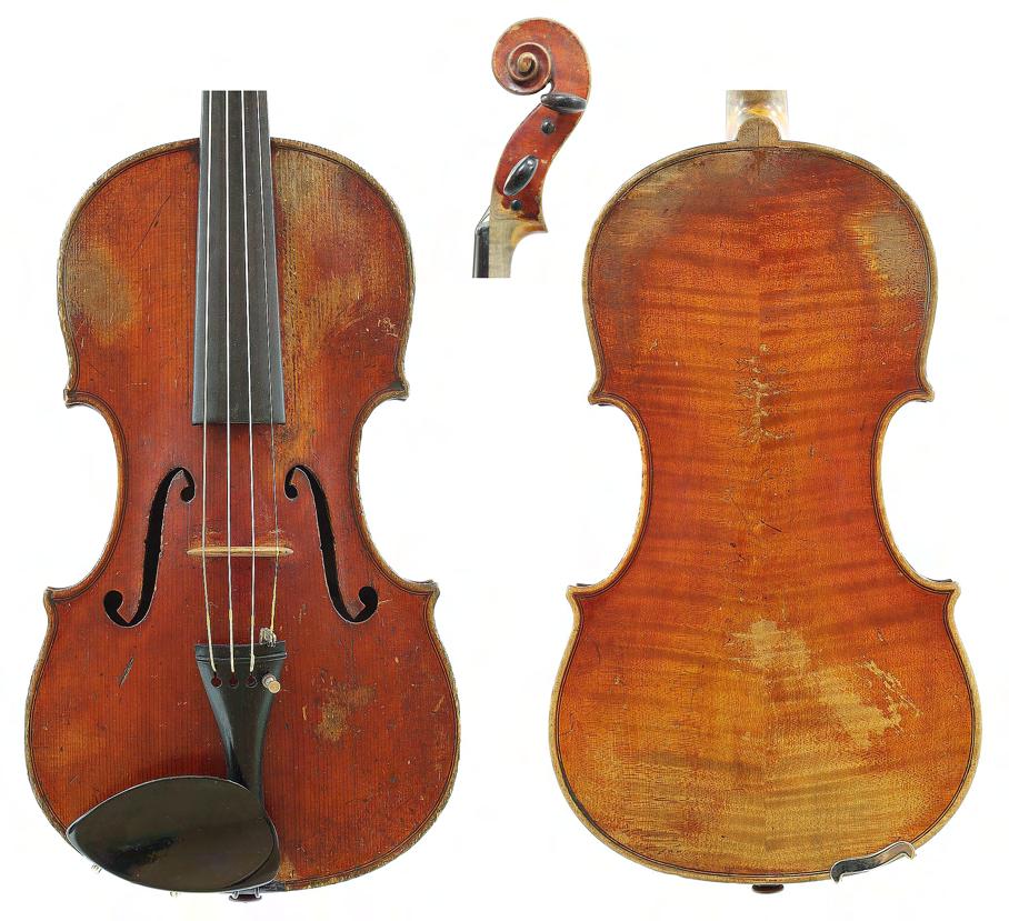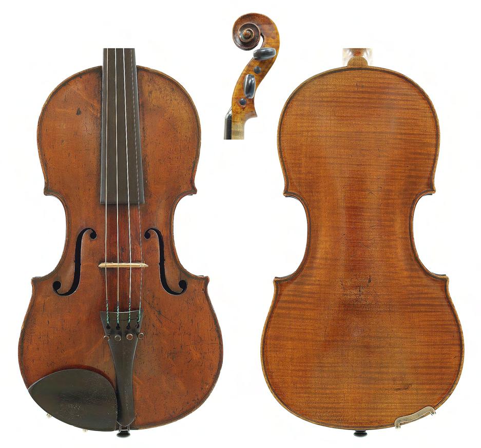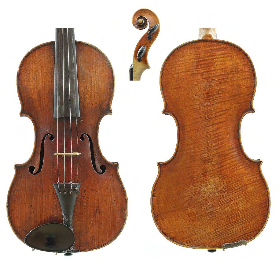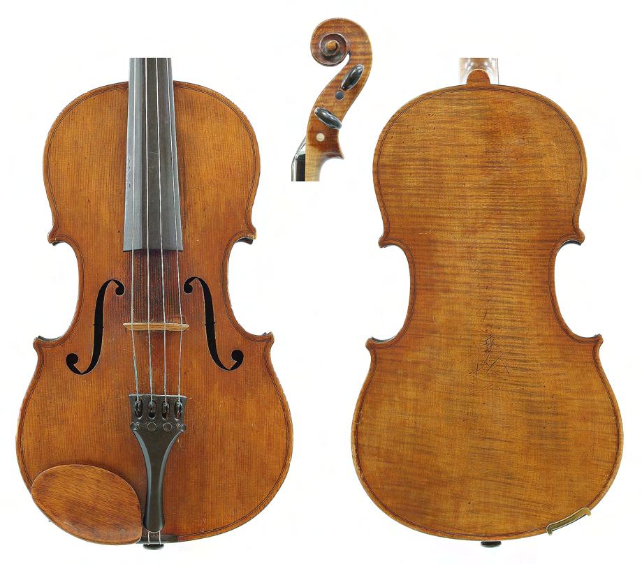 French violin possibly by Justin Derazey circa 1890, labelled Antonius Stradivarius..., the one piece back of faint medium curl with similar wood to the sides, the head of plainish wood, the table of a fine width grain and the varnish of a light reddish-brown colour on a golden ground, 14 3/16", 36cm £2000-3000