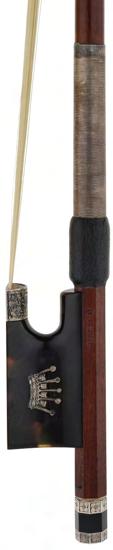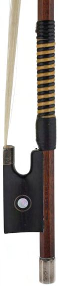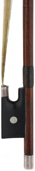 PRIVATE COLLECTION - German silver mounted violin bow by and stamped *Albert C. Schuster*, the stick octagonal, the ebony frog inlaid with silver rings enclosing pearl eyes and the ebony adjuster with two silver bands, 55gm (without hair)