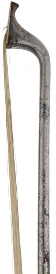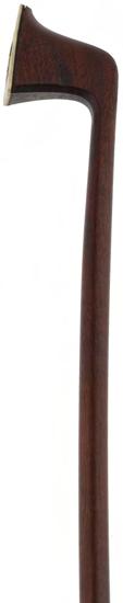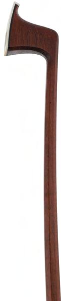 PRIVATE COLLECTION - Nickel-silver mounted violin bow, unstamped, the stick octagonal, the ebony frog inlaid with pearl eyes and the ebony adjuster with two nickel-silver bands, 53gm (without hair and lapping)