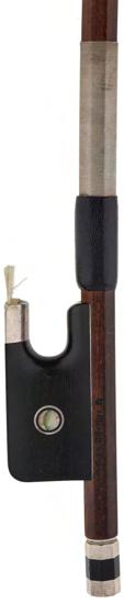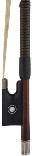 PRIVATE COLLECTION - German silver mounted violoncello bow by and stamped F.K. Muller, the stick octagonal, the ebony frog inlaid with silver rings enclosing pearl eyes and the ebony adjuster with two silver bands enclosing an ebony band inlaid with mother of pearl dots, 79gm