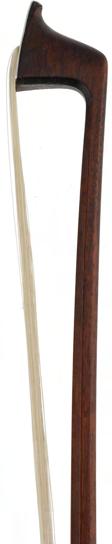 PRIVATE COLLECTION - German silver mounted violoncello bow by and stamped Rudolf Neudorfer, the stick round, the ebony frog inlaid with pearl eyes and the ebony adjuster with two silver bands, 81gm