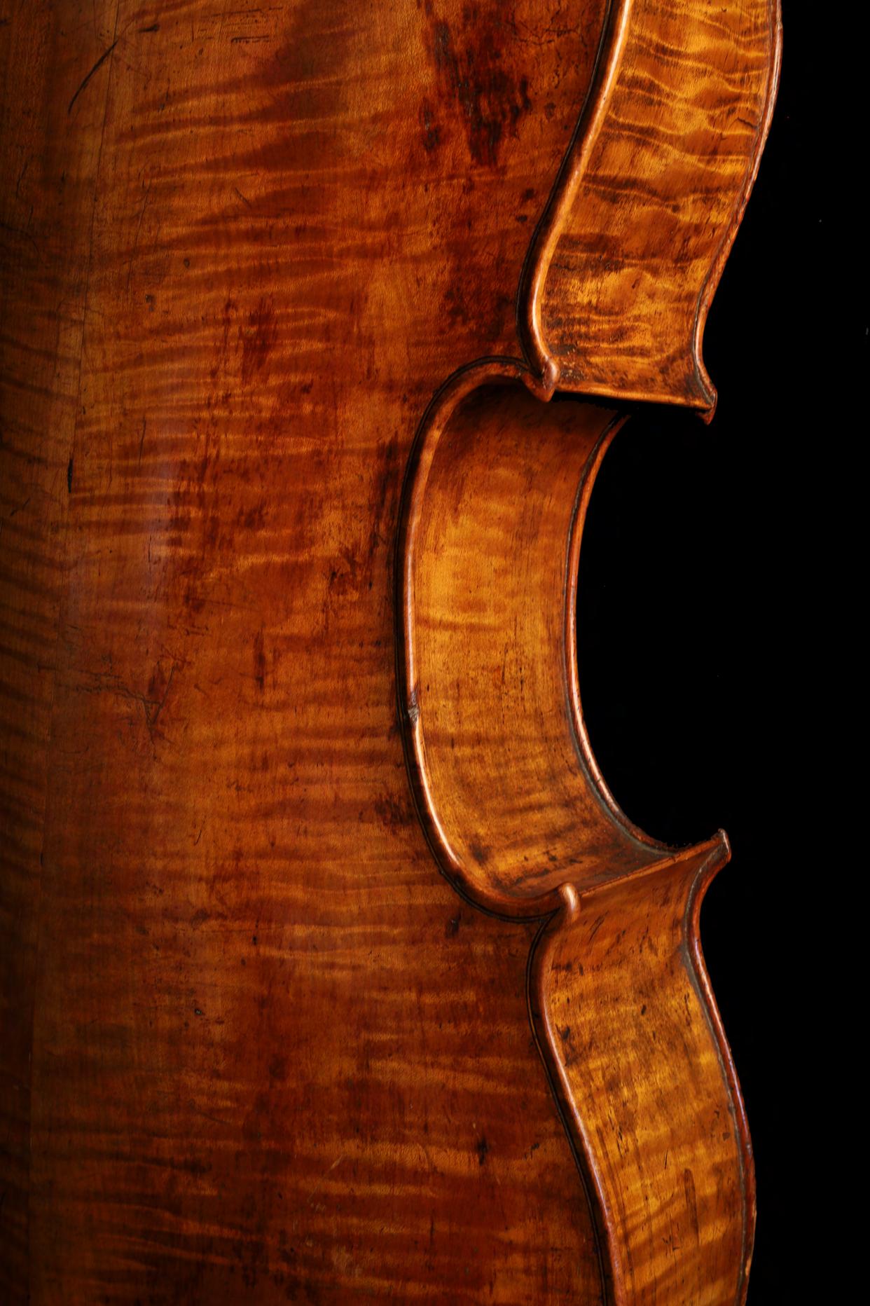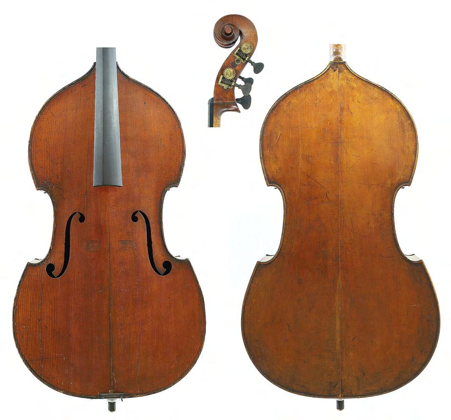 Good French double bass by Xavier Jacquet circa 1880, stamped no. 546 below the button, the jointed back of plainish wood with similar wood to the sides and head, the table of a wavy medium width grain widening to the flanks and the varnish of a light reddish-brown colour on a golden ground, back length 44 1/2" (113cm), stop length 24 1/2" (62.20cm) £5000-8000