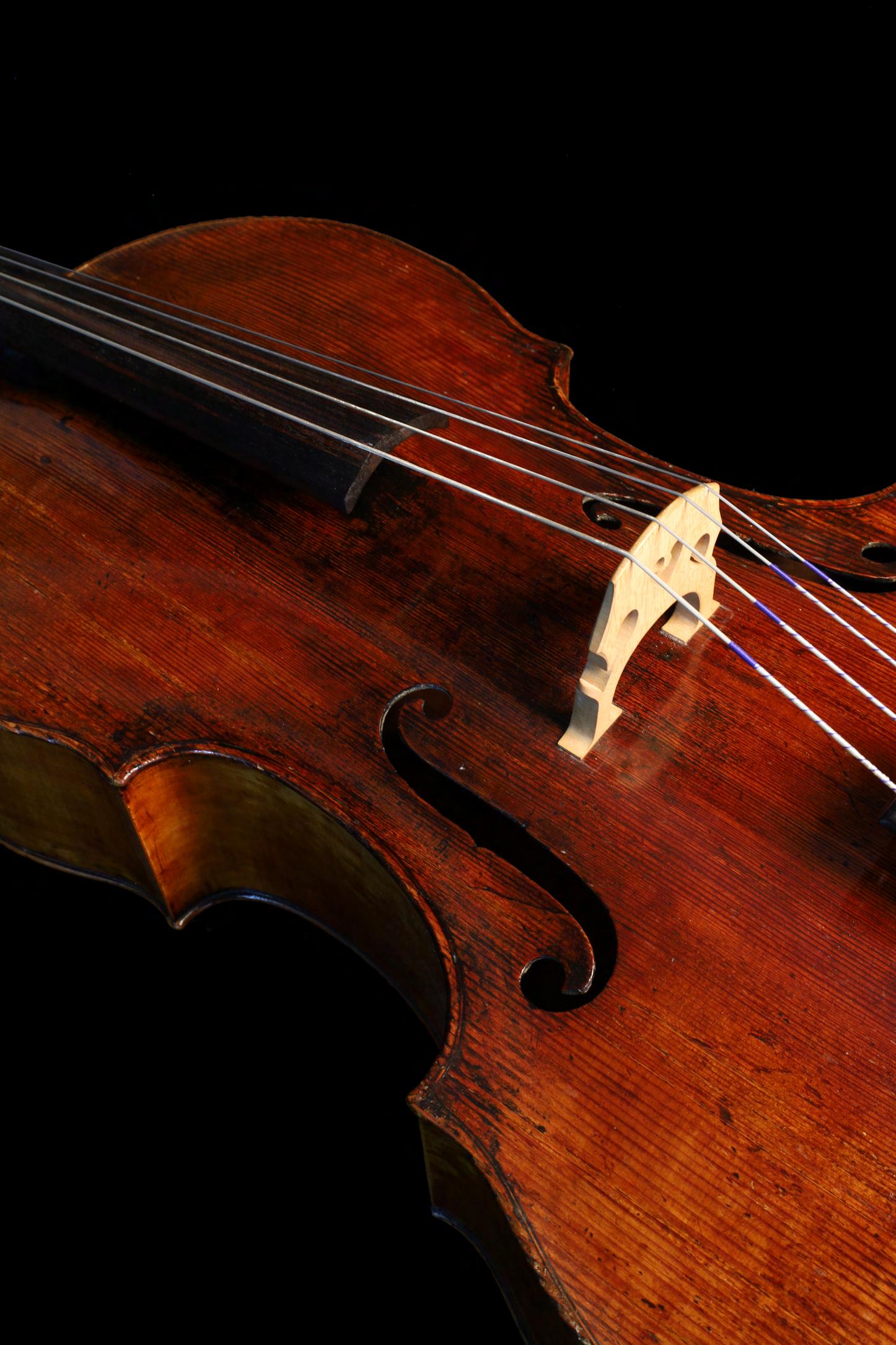 Interesting 18th century violoncello, possibly Vienese, unlabelled, the two piece back of plainish wood with similar wood to the sides and head, the table of a medium width grain widening to the flanks and the varnish of a reddish-brown colour on a golden ground, 28 3/4", 73cm, case £6000-9000