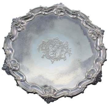 George II silver waiter, with an engraved lion crest within a scrolling cartouche, all within a raised cast scrolling rim border, raised on three feet, maker William Robertson, London 1758, 8" diameter, 13.8oz t